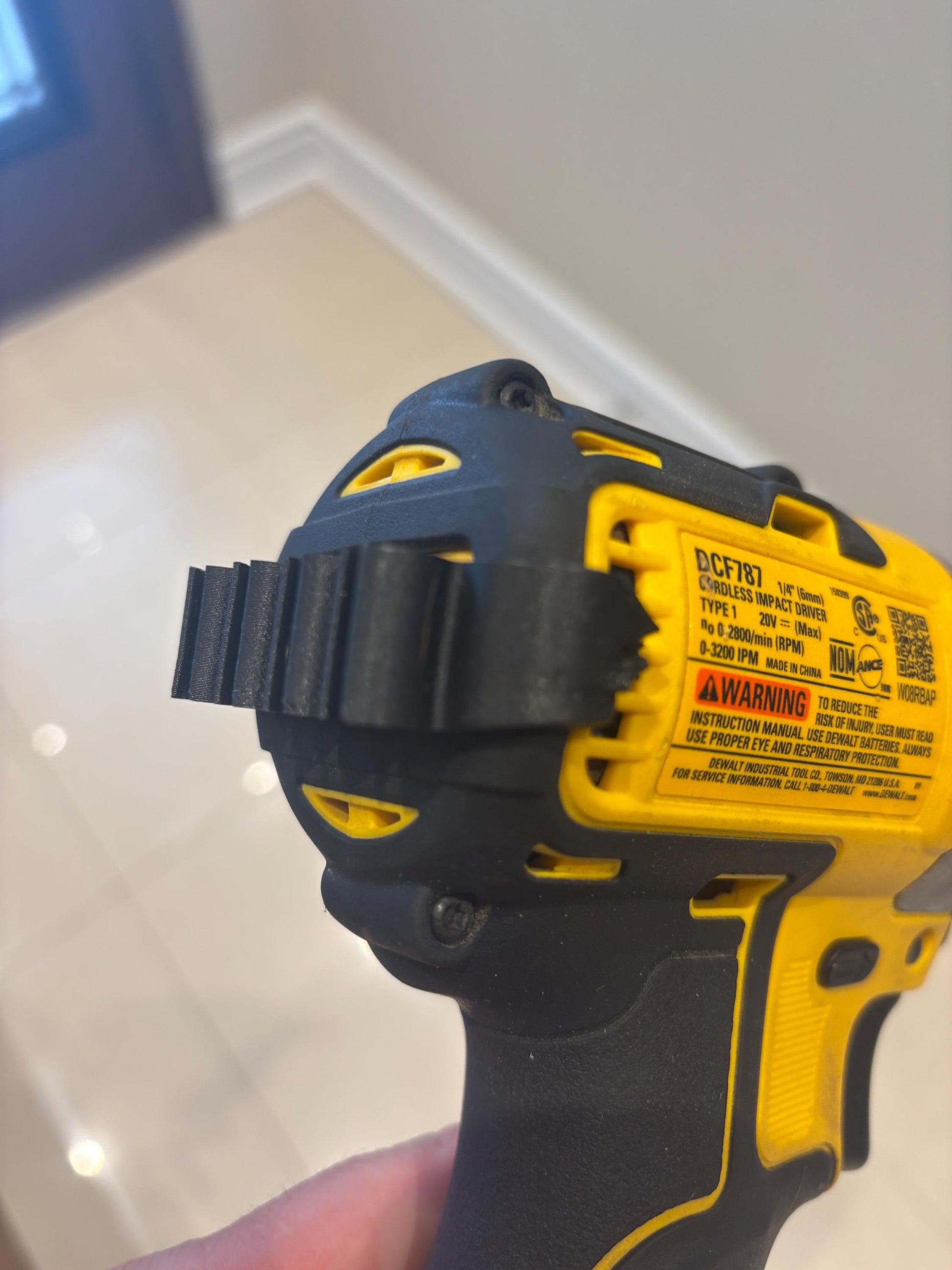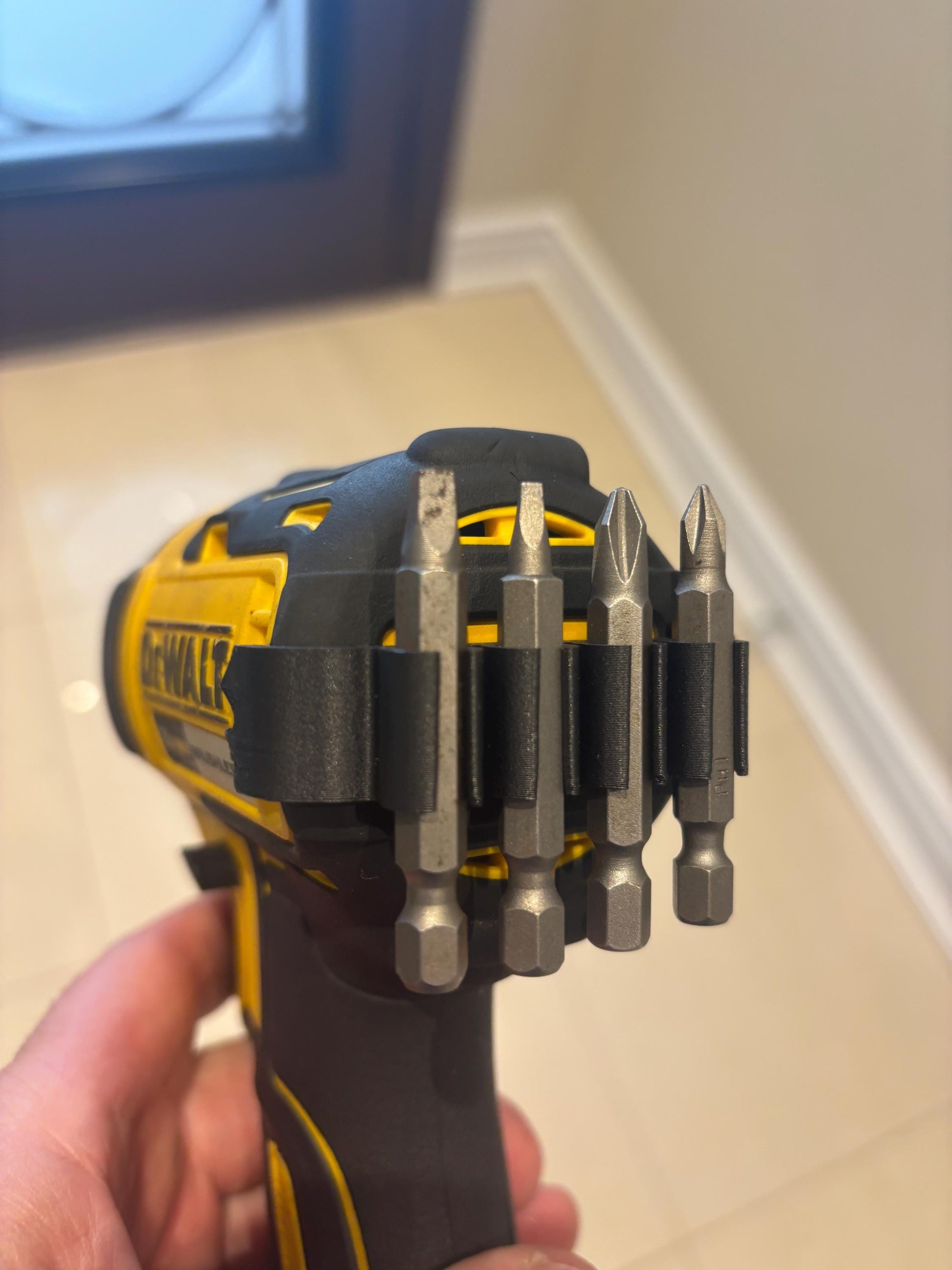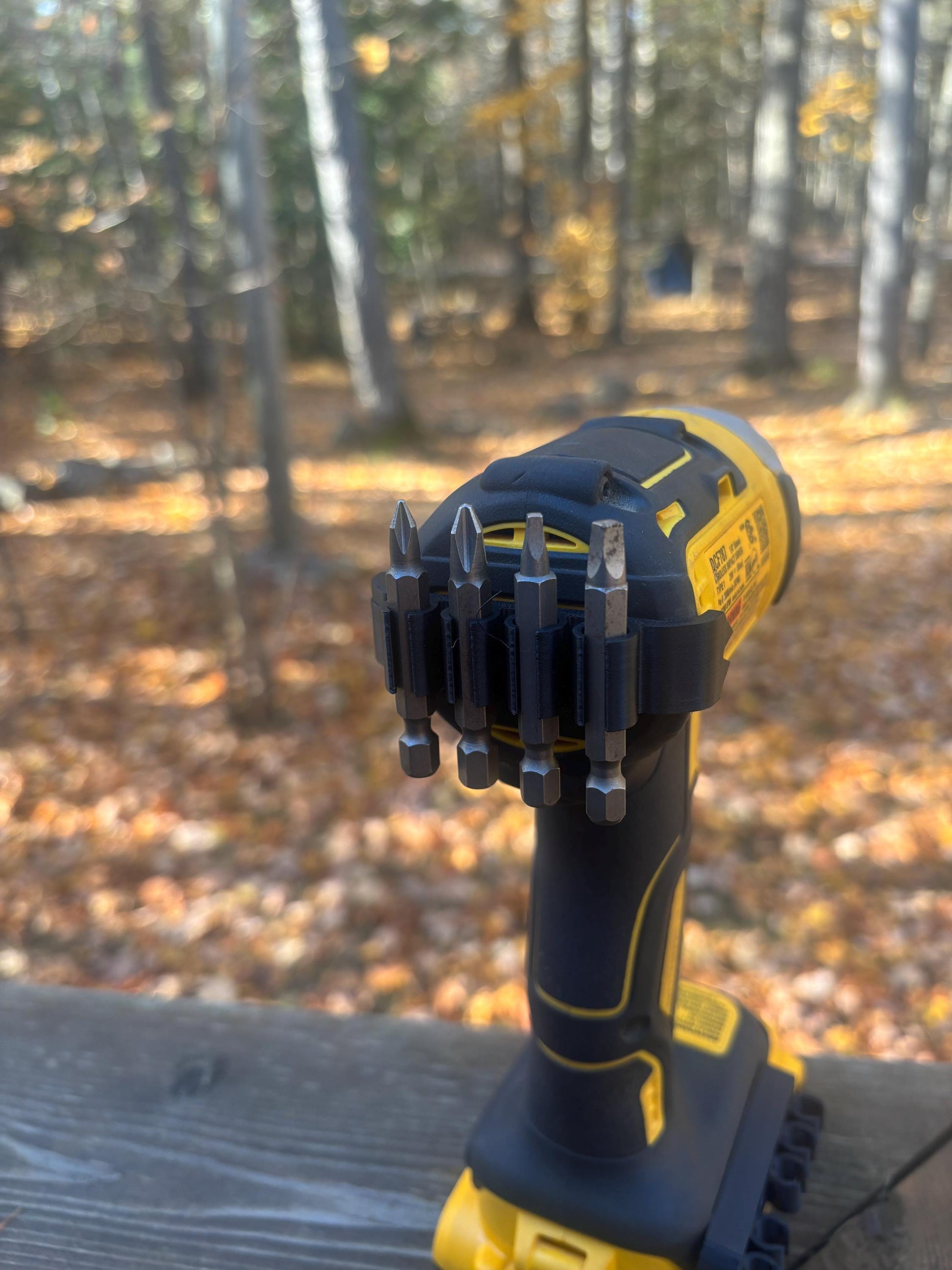 Please note that the price is for a pair of back mounted bit holders. Upgrade your DeWalt 20V drill or impact driver with custom 3D printed Four Slot Bit Attachment Holder for back of drill driver. The attachment is 3D printed using high strength carbon fiber reinforced filament for long lasting durability. Designed to be snapped onto the rear grills on the back of the DeWalt drill driver.