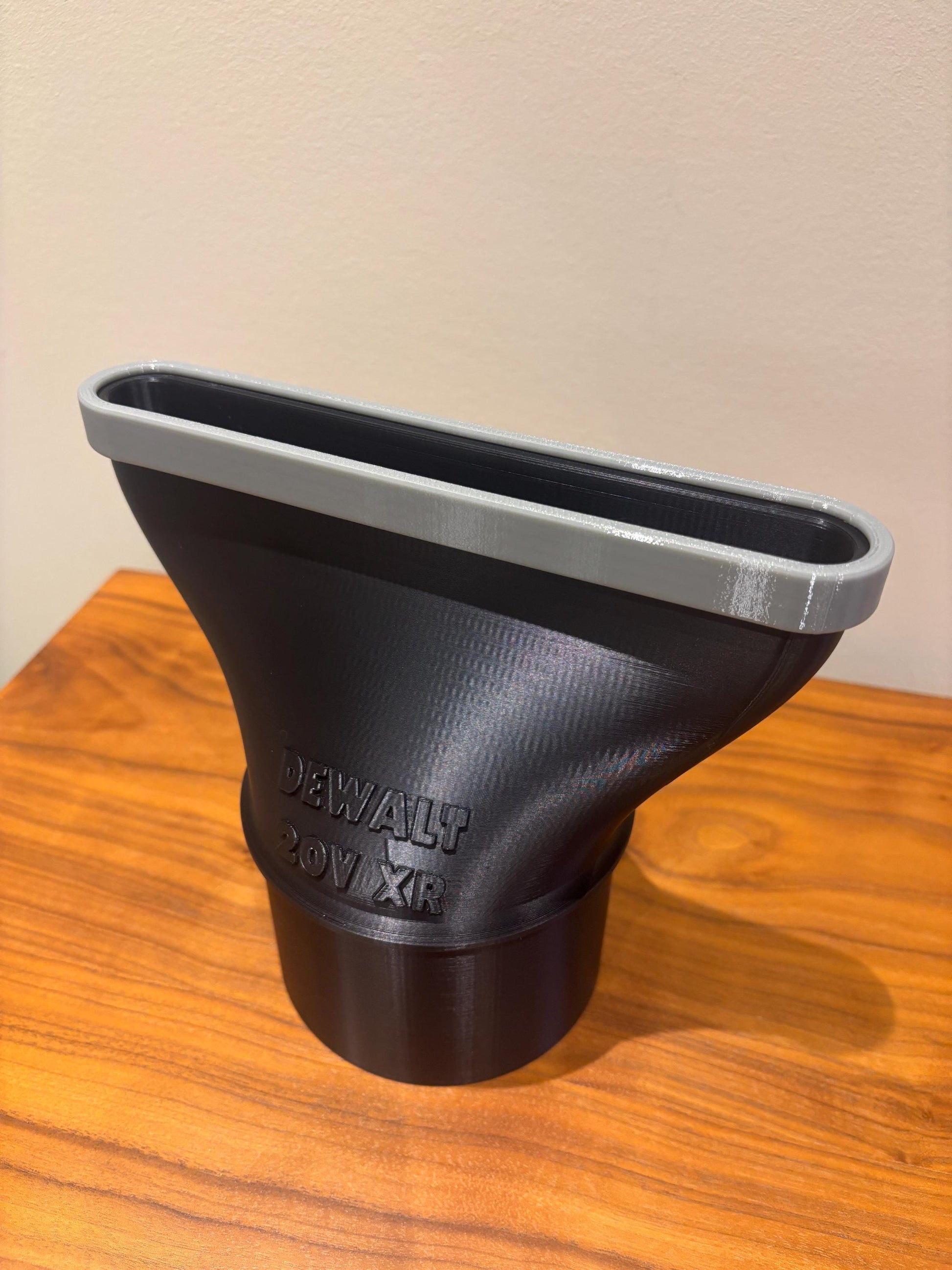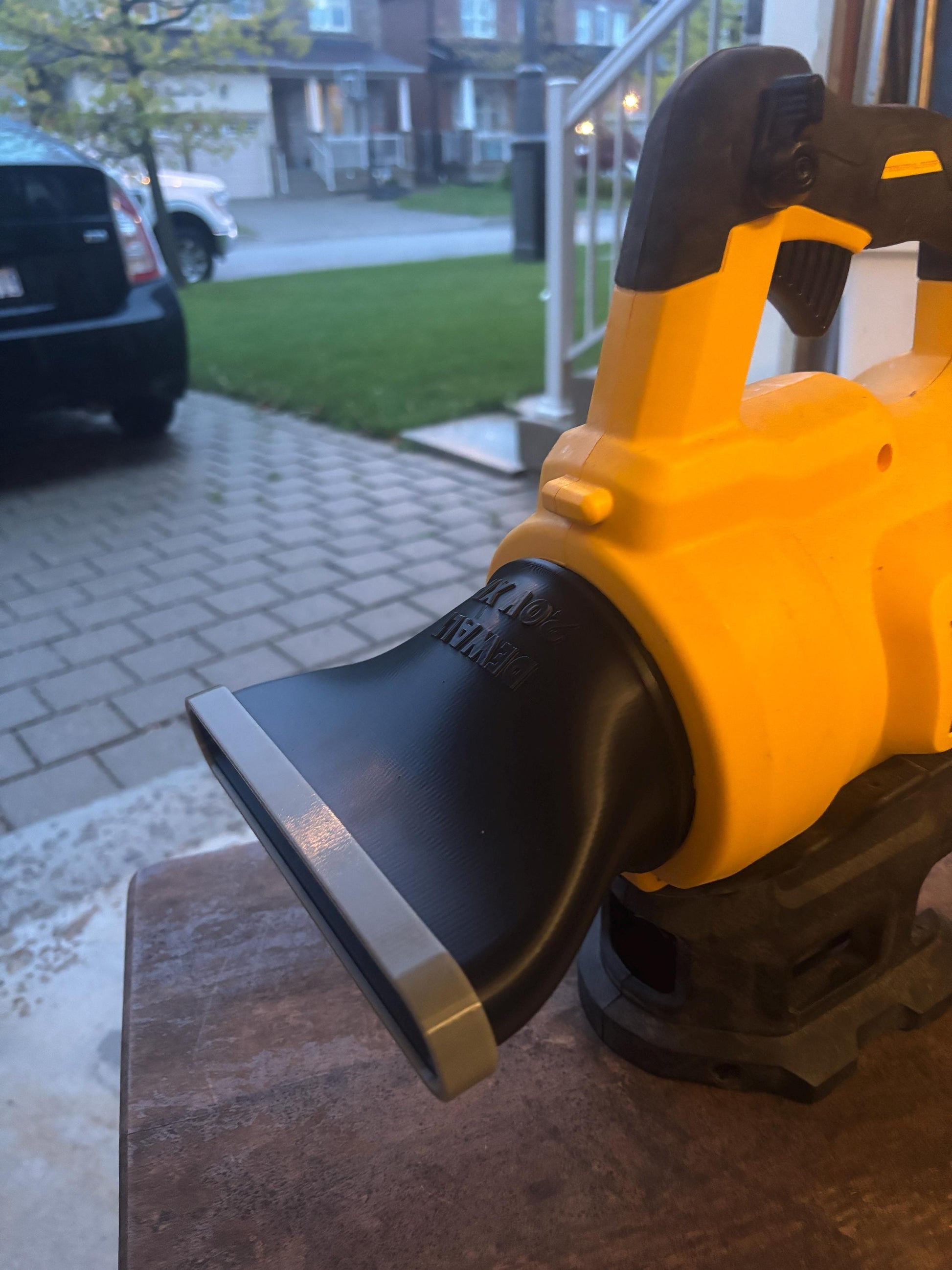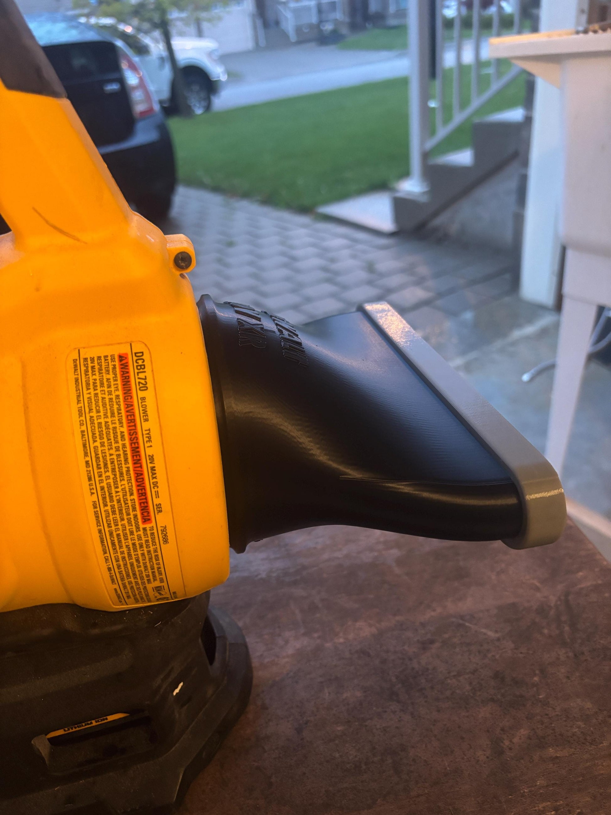 Upgrade your DeWalt 20V DCBL720 (gen-1 older model) Leaf blower with our custom made compact short flatid nozzle to dry your car or bike or anything else with ease! Works great for shop cleanup or car or bike drying/detailing. It is easy to replace back and forth with a standard long DeWalt nozzle without use of any tools. The nozzle securely attaches to the blower - won't blow off, yet is still removable with a sturdy latch. The top of the nozzle features flexible Thermoplastic Polyurethane ring to protect your vehicle's paint, ensuring a scratch-free experience. The attachment is 3D printed using high quality PETG filament for long lasting durability.