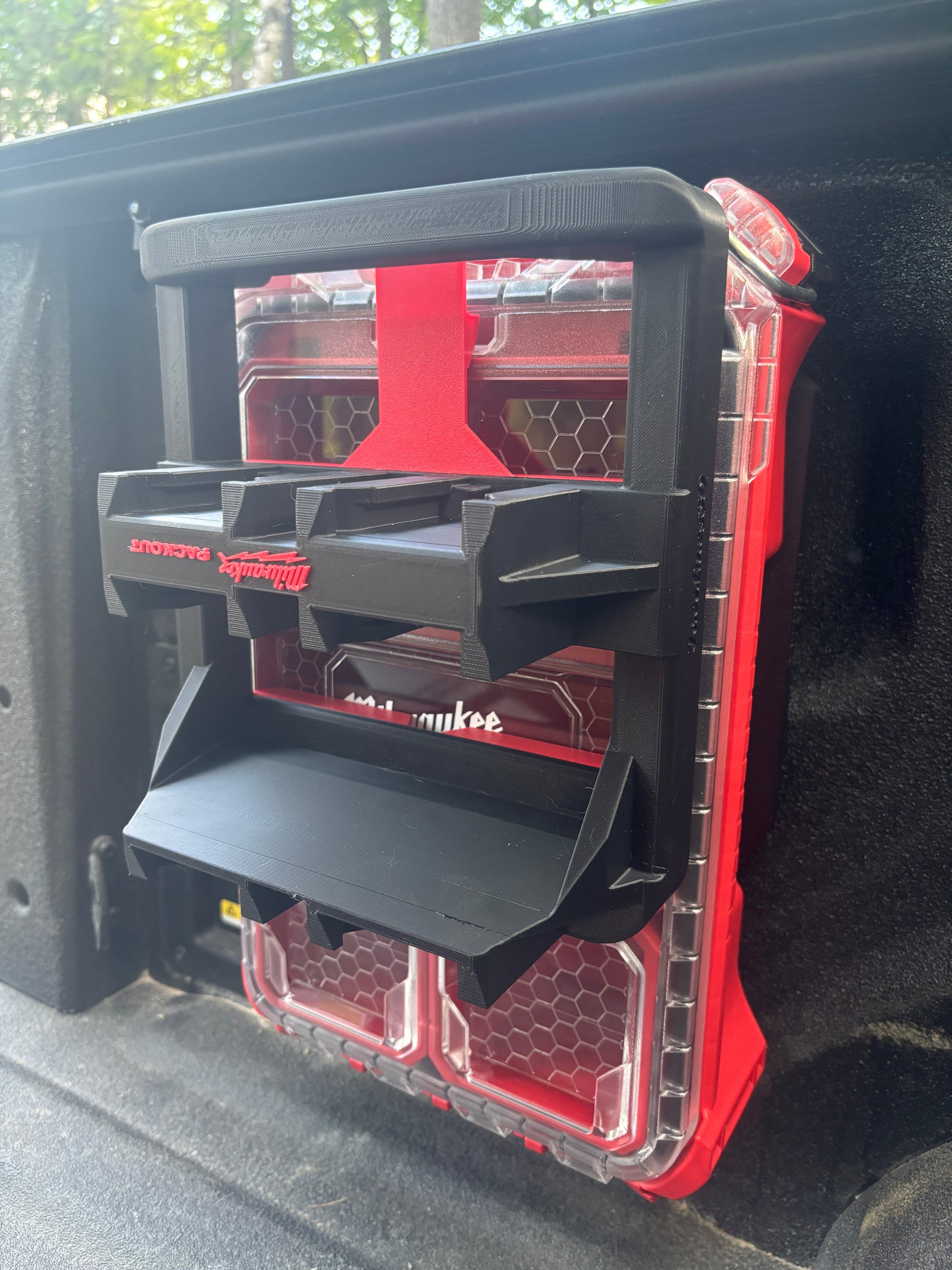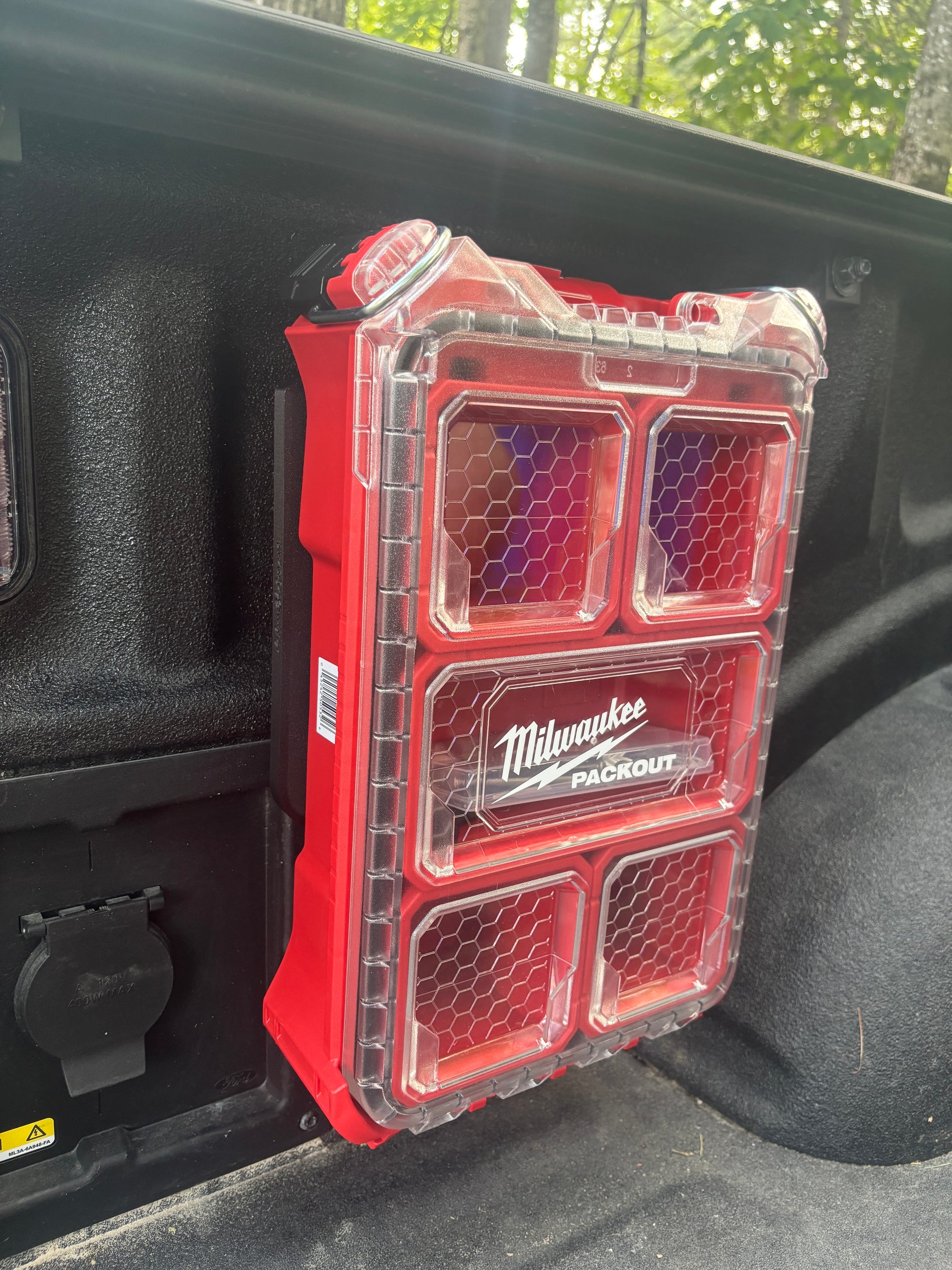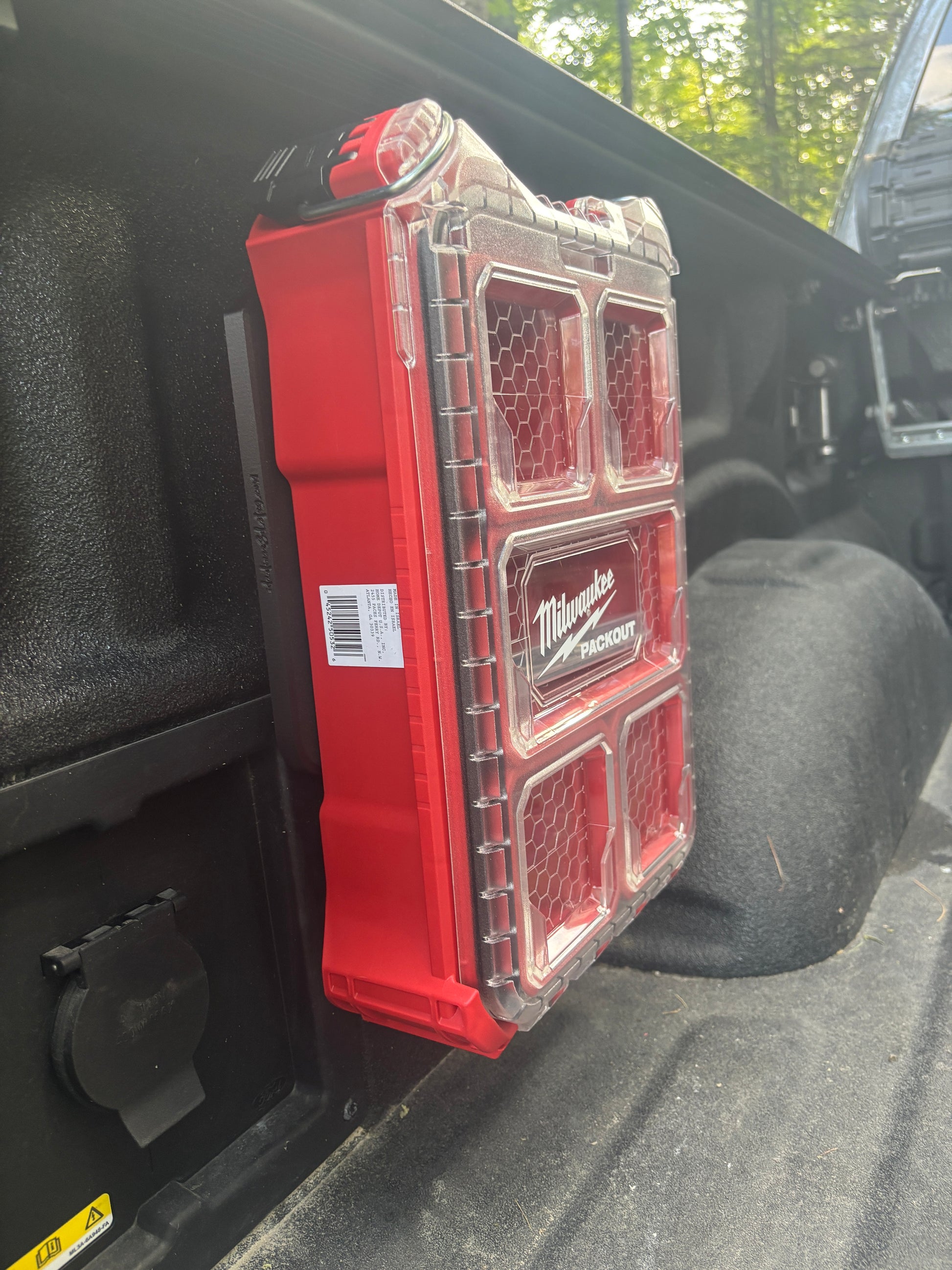 Discover a reliable solution for adding secure, weather-resistant storage to your Ford truck bed. This mount firmly holds Compact Milwaukee Packout organizer cases, keeping your straps, tools, and gear safely out of the cab. Install and secure your equipment in the truck bed quickly and easily.