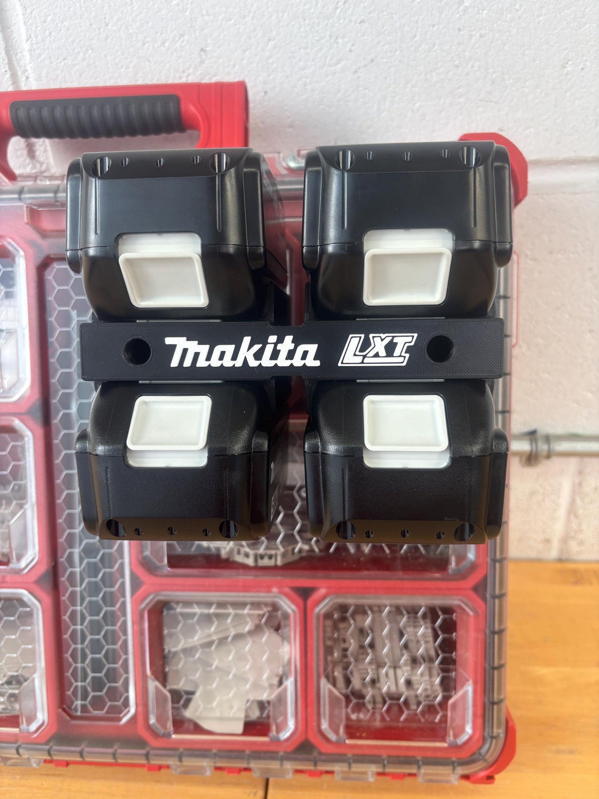 This brand new, custom made 4-Pack Makita 18V LXT Battery Wall Mount Holder is designed to hold, organize and protect your Makita 18V LXT series batteries on a wall or in a work truck. Milwaukee Packout cleats and Packout wall bracket are also available (optional). It accommodates 4 batteries, including the latest Makita 18V LXT models, with ample space for the largest batteries to be placed side-by-side. The mount features a latching mechanism that secures the batteries in place, preventing them from sliding out.